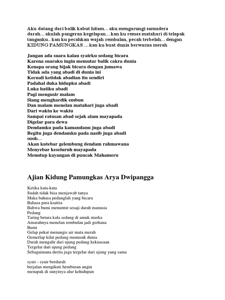 404 likes 5 talking about this. Arya dwi pangga Puisi Puisi hari ini Puisi pagi puisi pagi hari puisi pengantar pagi Puisi terlengkap. Kan ku pecahkan wajah rembulan pecah terbelahdengan KIDUNG PAMUNGKASkan ku buat dunia berwarna merah.