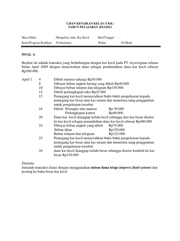 Contoh Soal Dan Cara Membuat Jurnal Dengan Metode Imprest Dan. Pembahasan soal Ukk 2018 Paket 1 PD MITRA. Soal Pencatatan Dana Kas Kecil.